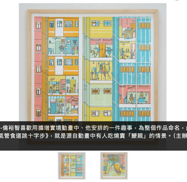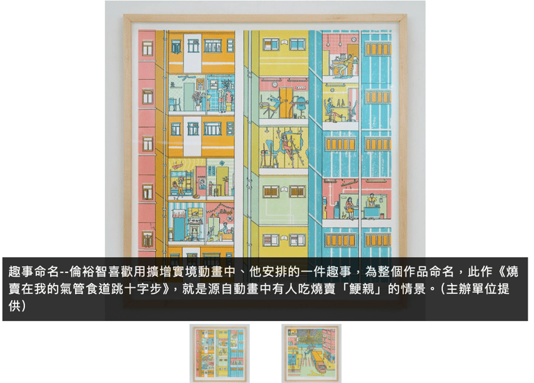 密集的畫面讓記者想起Where's Wally,人物表情和風格令人聯想到本地插畫家謝曬皮的作品。倫裕智說他最初做創作,是由插畫開始的,後來在學校接觸到版畫。他以絲網印刷方式做版畫,每次只能印刷版畫中的一種顏色,作品總共要上7次顏色和元素,分別是紅、橙、黃、綠、藍、陰影和線條,只要有一次對位錯了,或顏料塗抹得不平均,就要棄畫重印。他笑指版畫「有時真的很乞人憎,但一做好又很開心」,而其實創作版畫也可說是面對幸與不幸的過程;他亦喜歡版畫的顏色,例如可以加入閃爍效果,又可以比普通印刷用的印刷四分色調製更理想的顏色。